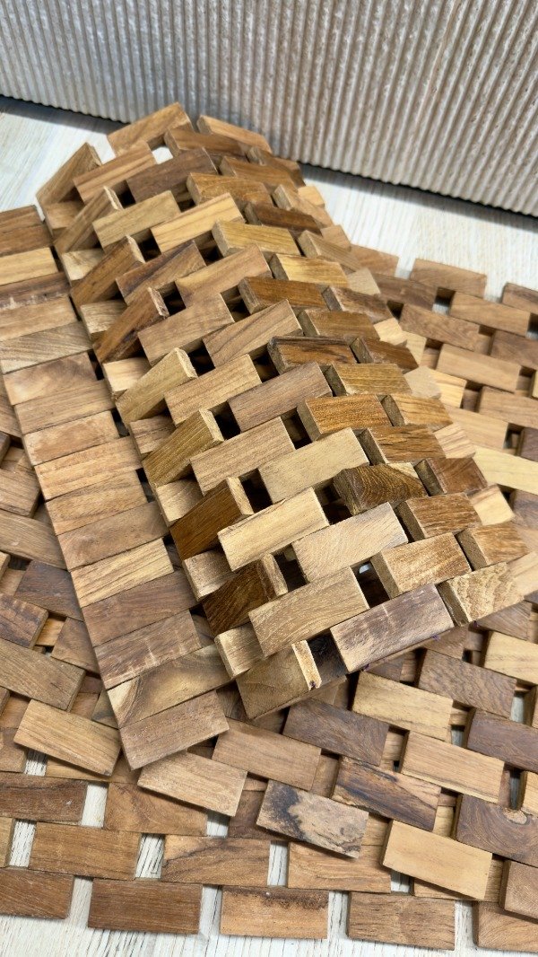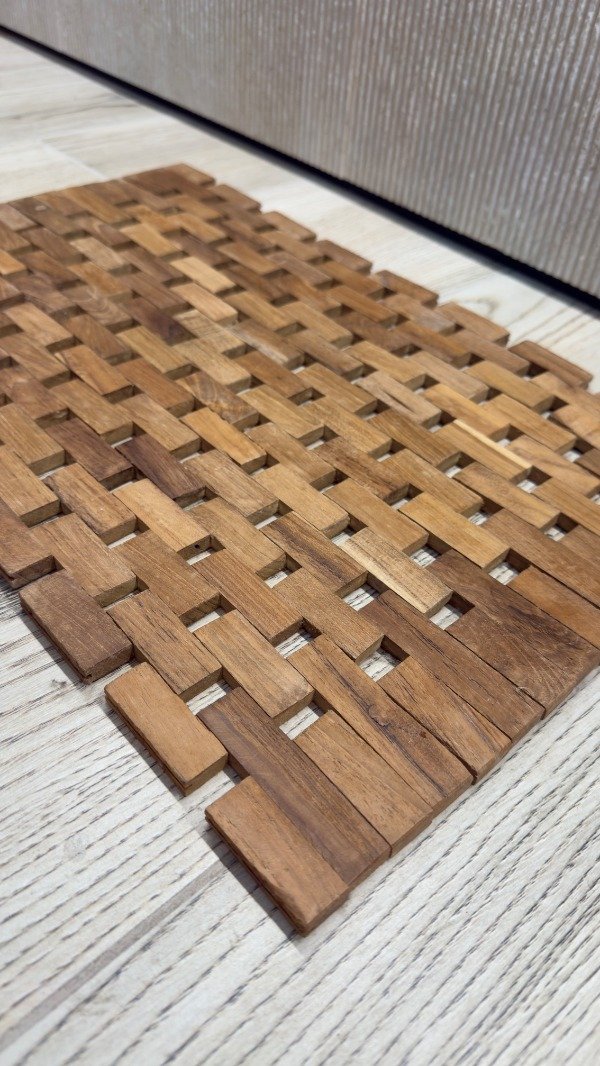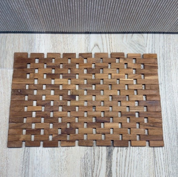 Alfombra de madera natural teka unida con hilo reforzado. Costura interna. Medida: 34 cm. x 52 cm. Origen: Indonesia.