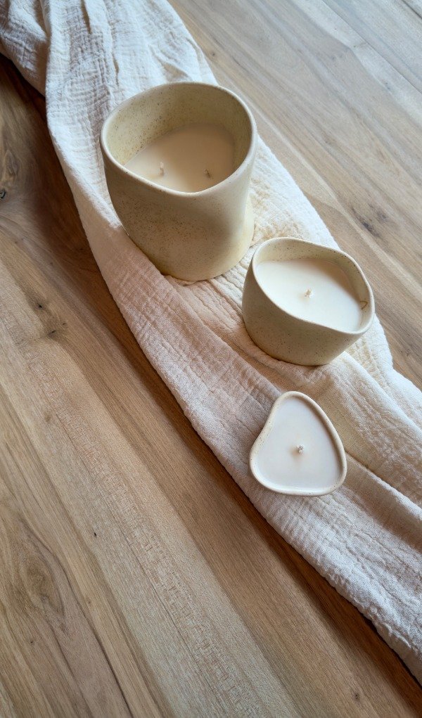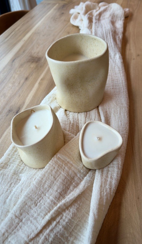 Vela cera de soja. Apta refill. Pieza de cerámica reutilizable. Artesanales, ninguna pieza es igual. Apta para contener agua, apta calor y lavavajillas. Disponible en 3 medidas.