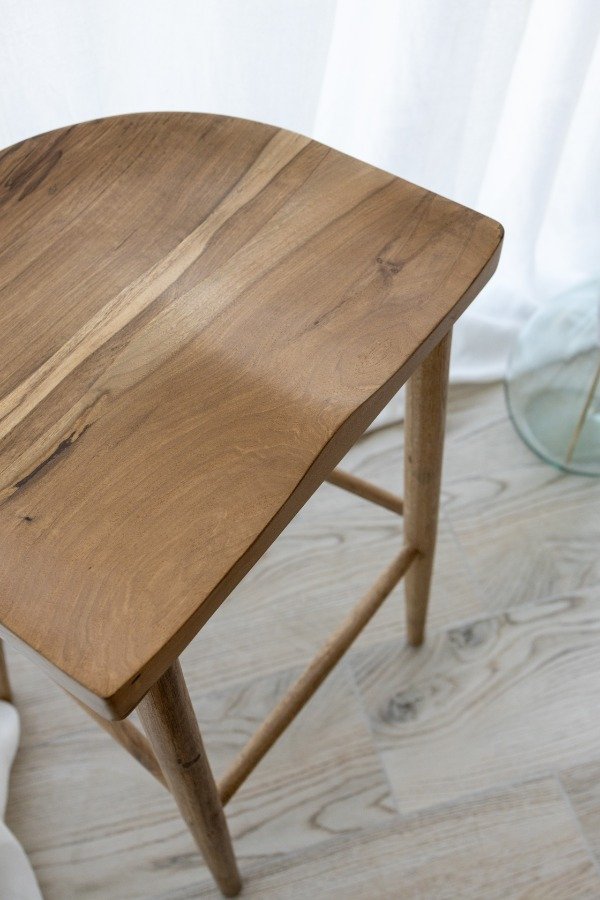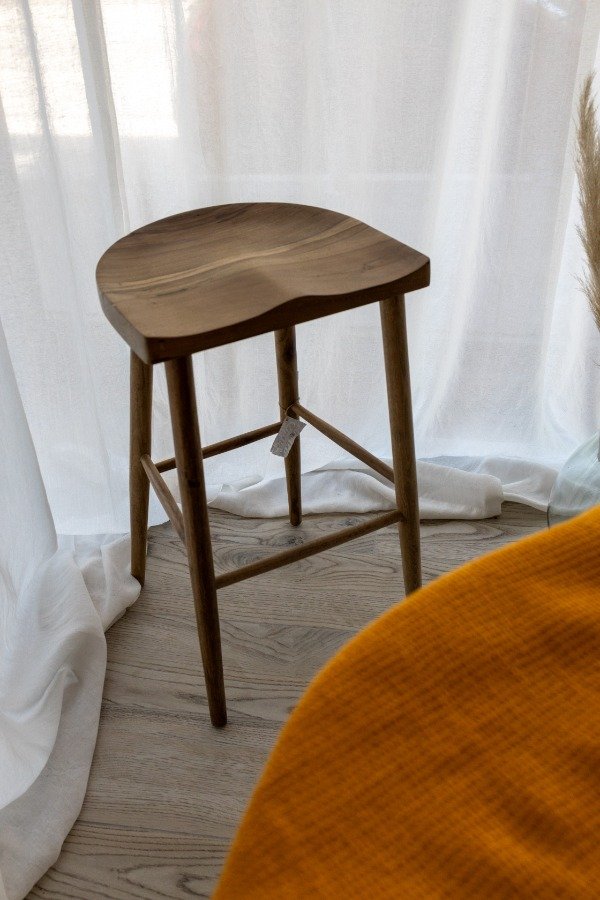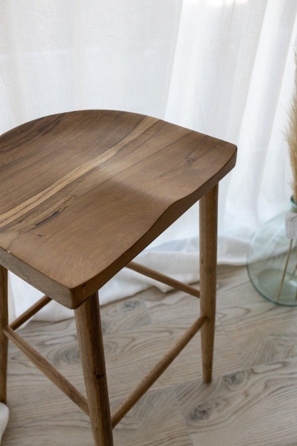 Banqueta de madera maciza de petiribí o la opción black en madera maciza laqueada. Las banquetas están sometidas a un proceso de triple lijado y tratamiento al poliuretano, protegiendo la madera y conservando su tono y veta original.