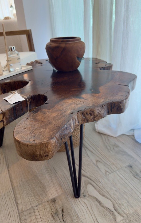 Mesa rodaja elaborada en madera teka de Indonesia, pieza única que aportá elegancia y calidez. Diseño natural que resalta la belleza de la madera. Esta mesa no solo es funcional, sino también una obra de arte.