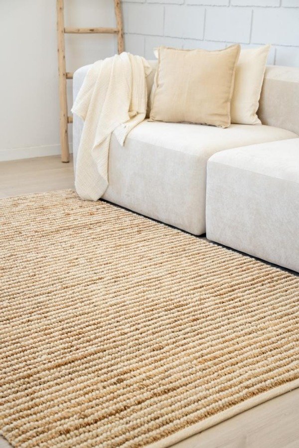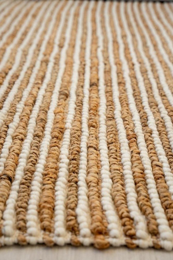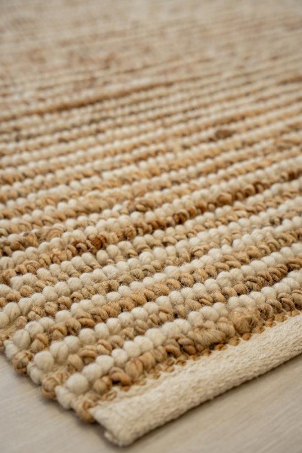 50% yute natural - 50% lana. Trenzado artesanal. Origen: India.