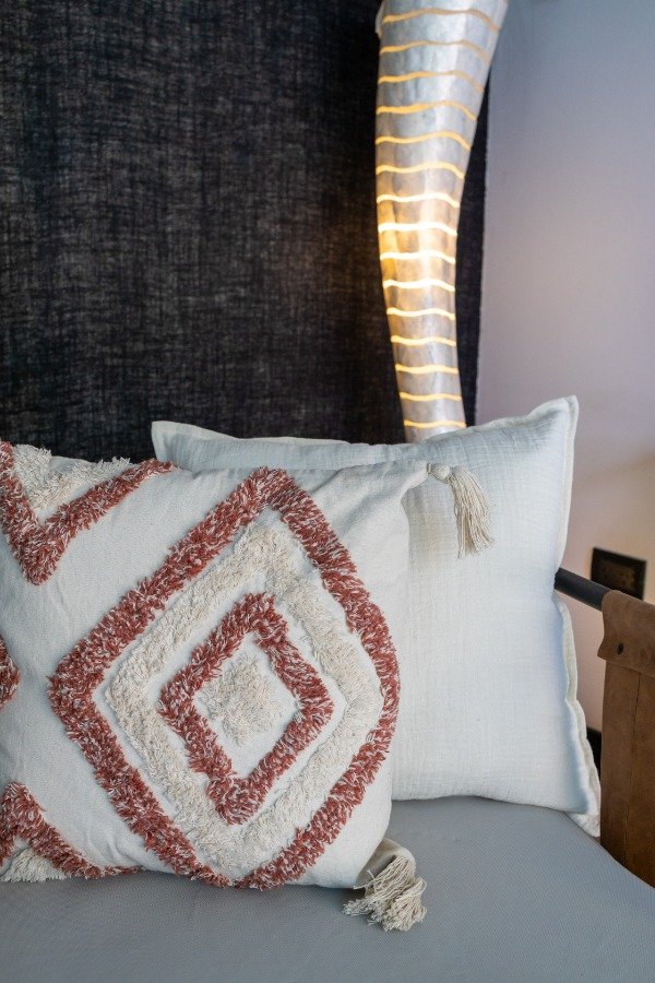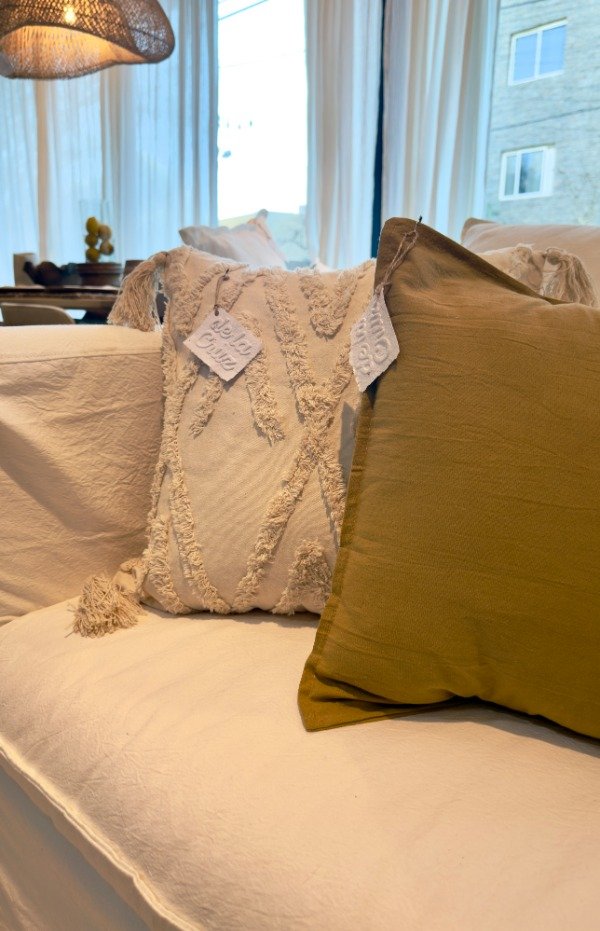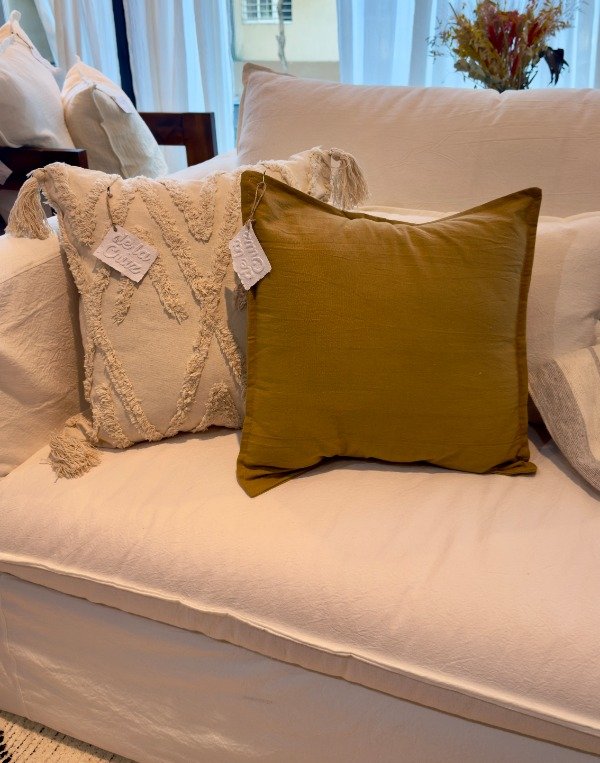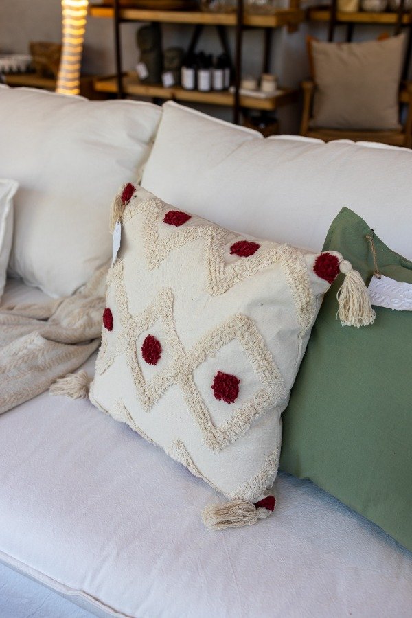 Almohadón con borlas, varios diseños. Cierre trasero. 100% Algodón. Incluye relleno de vellón siliconado. Tamaño 45 x 45. Origen: India.