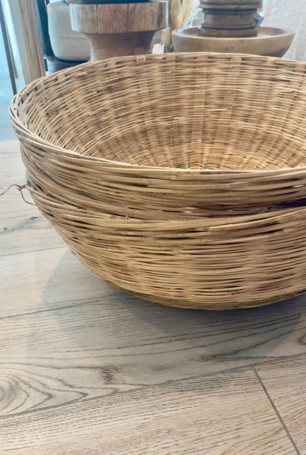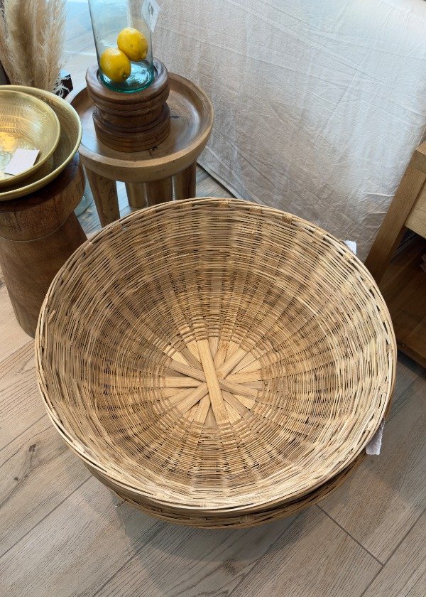 Cesto leñero, mimbre reforzado. Medida: 25 cm. alto x 72 cm. diámetro. Origen: Indonesia.
