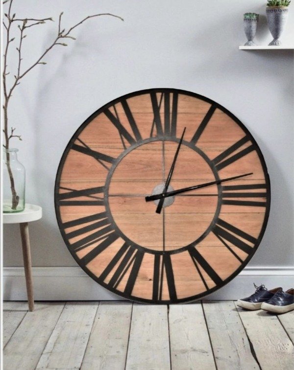 Reloj de pared realizado en madera y hierro. Medida: 60 cm. diámetro.