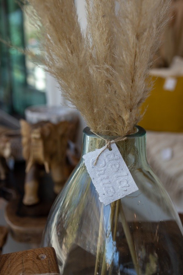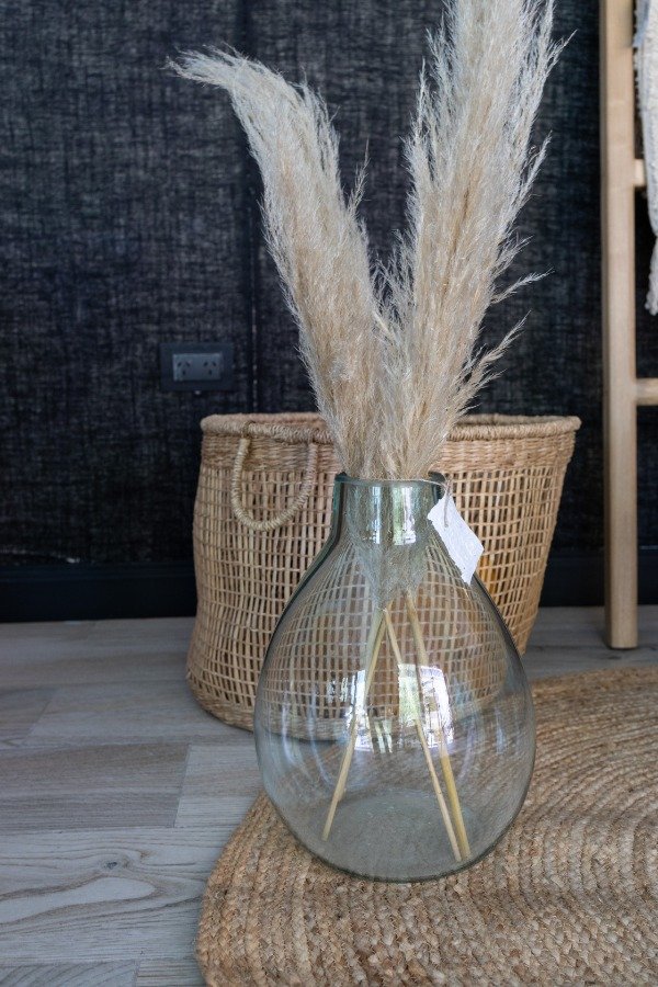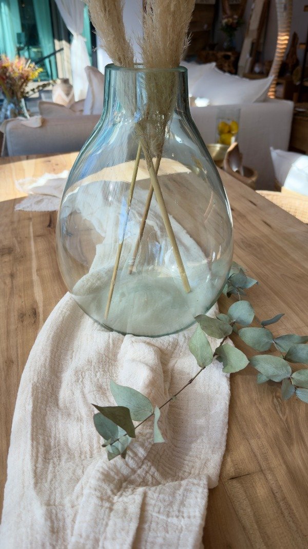Florero natural liso, vidrio soplado a mano. Medida: 35 cm. alto x 25 cm. ancho.