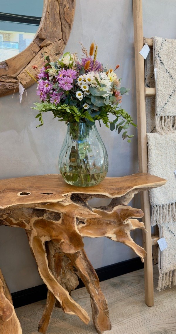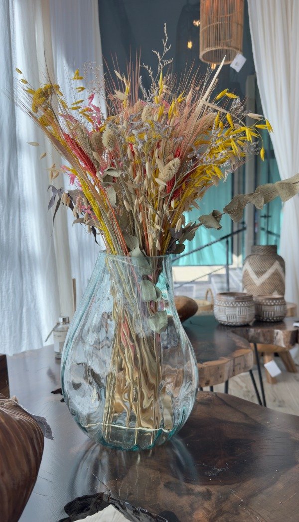 Florero natural con facetas. Vidrio soplado a mano. Medida: 35 cm./ 40 cm. alto