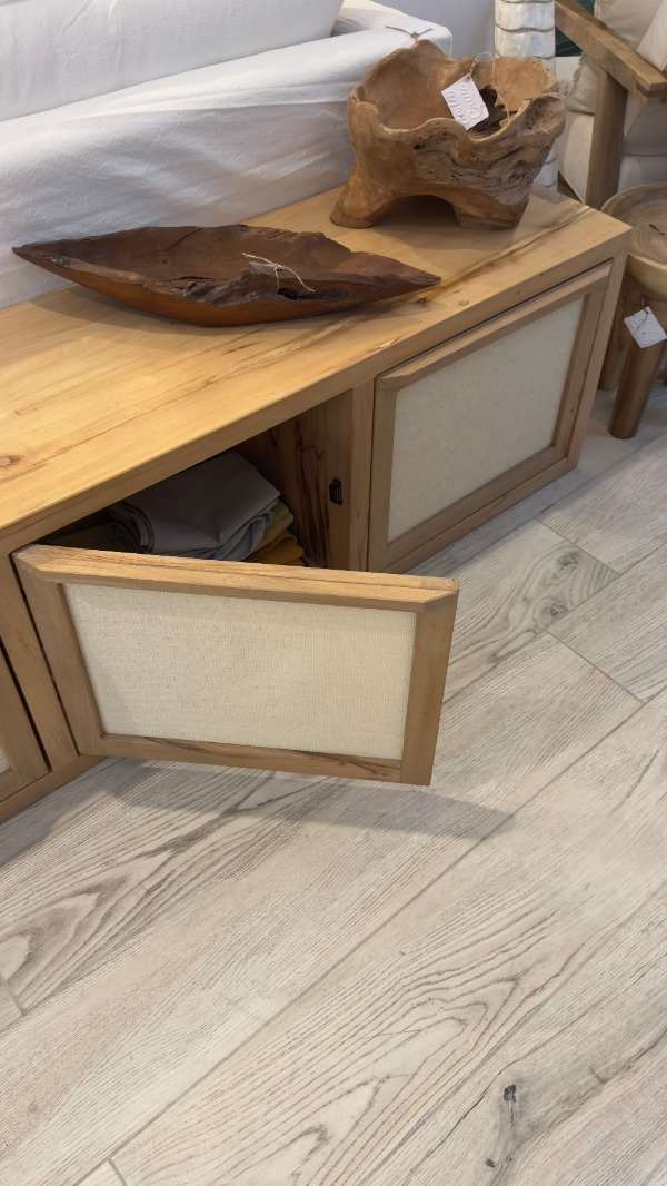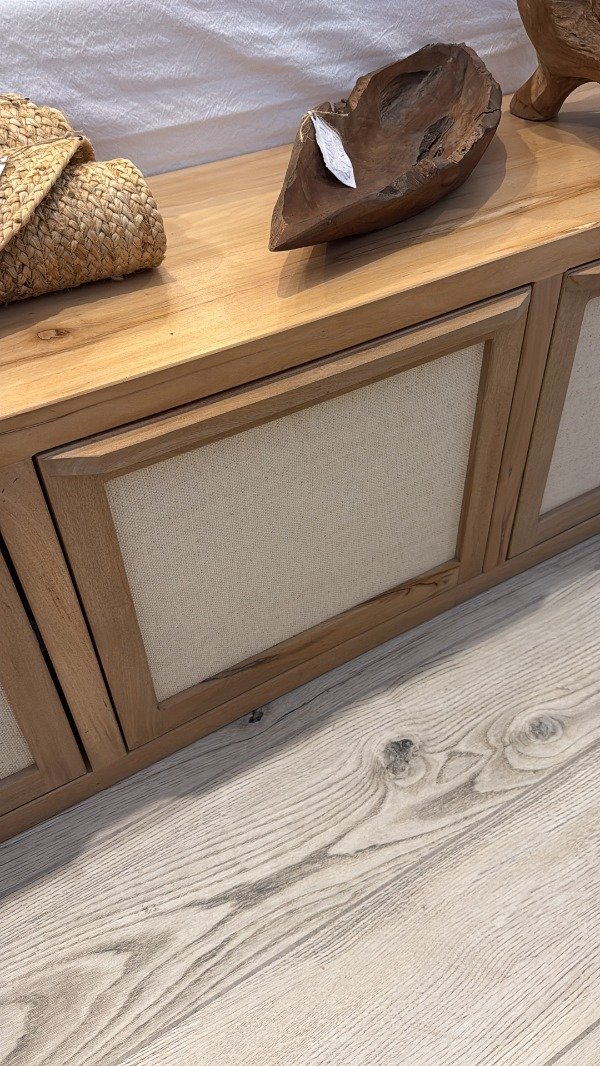 Rack madera natural zoita. Detalles en puerta de rafia (fibra natural tejida). Medidas: 0. 43 m. prof. x 1.75 m. largo x 0. 50 alto. Diseños a medida, CONSULTAR.