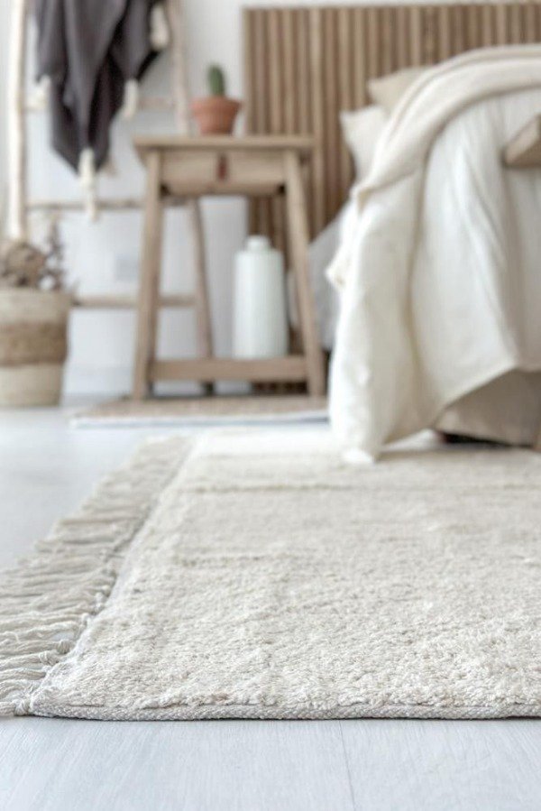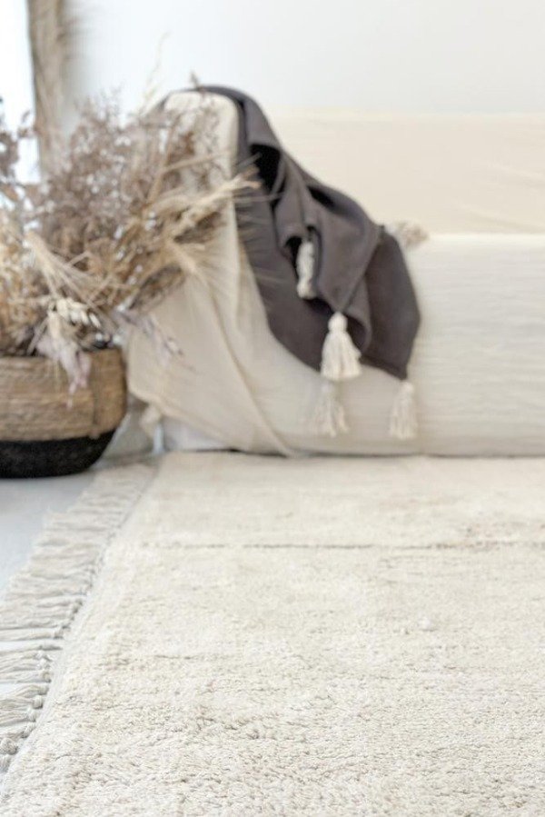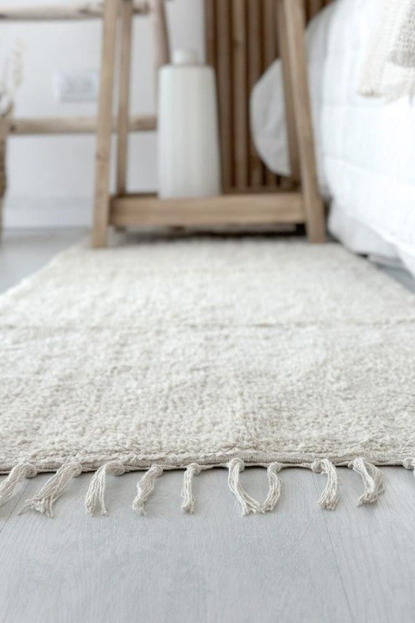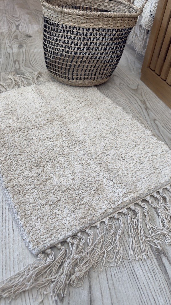 Alfombra lisa, color crudo. 100% algodón. Lavable en lavarropas. Varias medidas disponibles. Origen: India.
