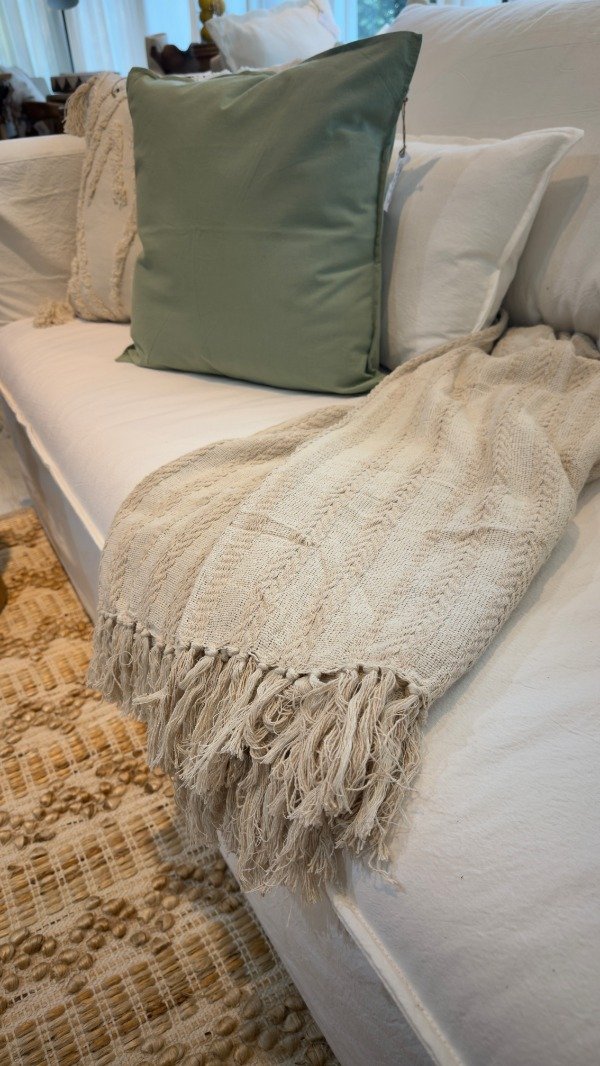 100% Algodón. Con texturas y terminación en flecos. Medida: 125 x 150. Origen: India.